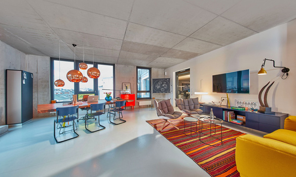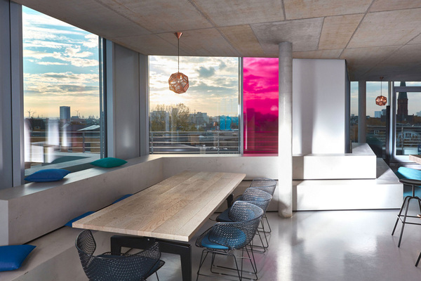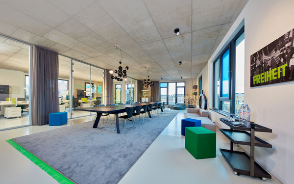 freiheit公司的文化精神通過室內(nèi)的裝飾材料和形式得以表達。組織團隊的開放辦公區(qū)裝點以超大型的木制工作臺;這里配有生活廚房、大禮堂以及亮麗的創(chuàng)客空間,隨手涂寫的黑板墻、大型木制工作臺、甚至還有壁爐,公司的程序員都在這個頂層空間共同辦公、合作與休閑交流。
