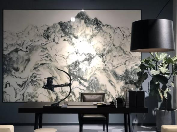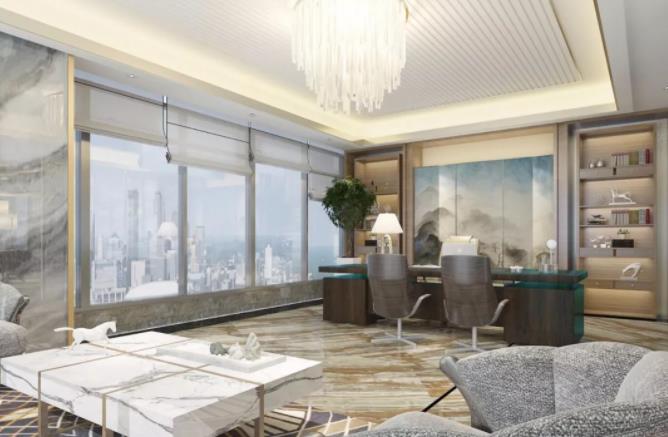 3、總經(jīng)理辦公室裝修,匠心獨(dú)具,辦公桌后的山水畫倚墻而立,成為整個房間的亮點(diǎn)所在,復(fù)古的潑墨大理石壁畫,淡泊的寫意感,氤氳肆意灑脫亦無重負(fù)的意境。白色的沙發(fā)與大理石圓桌相互配合,既保存了一以貫之的輕奢格調(diào),也不失商務(wù)談判應(yīng)有的沉穩(wěn)氣氛,并且充分保證了座位的充足。一對一的談判桌,配有相應(yīng)的茶具,滿足商務(wù)禮儀之需,也為整個空間增添了文化氣息。