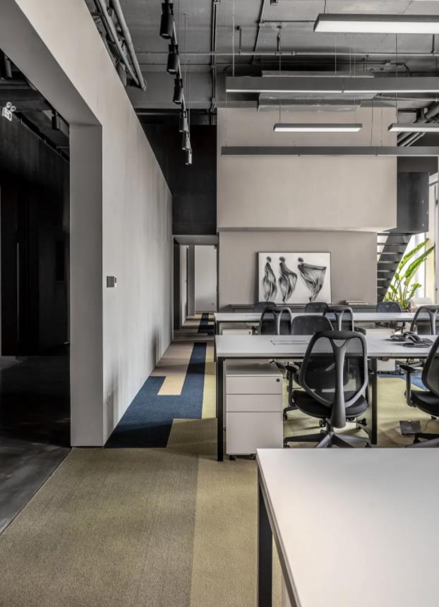 3、工業(yè)風(fēng)暗黑系辦公室設(shè)計(jì):極富張力的空間構(gòu)建、精彩的造型和圖形設(shè)計(jì)、暗黑色調(diào)中的藝術(shù)配色,整個(gè)空間在視覺(jué)的張力中呈現(xiàn)出工業(yè)時(shí)代的厚重感和當(dāng)代理念的時(shí)尚感。建筑內(nèi)部以槽鋼構(gòu)架呈現(xiàn)出原始粗獷的工業(yè)魅力,張弛有度的空間體量以及混凝土和木飾面又帶來(lái)親切的現(xiàn)實(shí)感。直白的空間構(gòu)建,加以色彩的輔助所產(chǎn)生的力量感和輕盈感,使整個(gè)空間充滿著視覺(jué)的張力和優(yōu)雅靈動(dòng)的藝術(shù)氣韻。室內(nèi)以開(kāi)闊的木樓梯引導(dǎo)的中軸線規(guī)劃功能布局。木樓梯不僅緊密連接上下兩個(gè)樓層,也是多元化的活動(dòng)中心,面向?qū)?cè)的咖啡吧臺(tái),形成一處大型社交集會(huì)中心。在這條中軸線上還設(shè)有許多共享會(huì)議室等一眾輔助空間。中軸線兩側(cè)是工作區(qū),既有開(kāi)放的共享工位,也有各種比例的獨(dú)立工作間。在整個(gè)暗調(diào)的氛圍中,設(shè)計(jì)團(tuán)隊(duì)以一抹亮黃驚艷了整個(gè)視覺(jué)!再加以深深淺淺優(yōu)雅晴朗的藍(lán)色,猶如一首輕盈悅動(dòng)的歌曲在空間流動(dòng)。