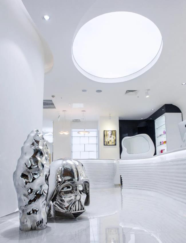 2、設(shè)計(jì)師用鏡面不銹鋼雕塑,巧妙融于時(shí)尚設(shè)計(jì),呈現(xiàn)出個(gè)性閃耀的藝術(shù)特色。金屬鏡面的材質(zhì),形成反射,使空間層次更加豐富。前臺(tái)背景墻的鯨魚立體浮雕壁飾,簡約和優(yōu)雅的結(jié)合,有著高品質(zhì)且簡單舒適的生活態(tài)度。辦公樓前臺(tái)做曲線設(shè)計(jì),邊緣的發(fā)光燈條,再次勾勒出前臺(tái)優(yōu)美的線條。高檔時(shí)尚的美發(fā)椅,加厚海綿坐墊,不銹鋼底盤,每一處都與空間融合。天花上不規(guī)則的燈,像是發(fā)著光的銀河。