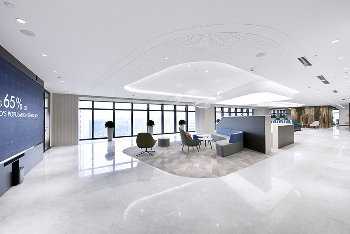 3、時(shí)尚高檔辦公樓前廳設(shè)計(jì):作為前廳,展現(xiàn)的不僅是企業(yè)的硬件形象,也是品牌的軟實(shí)力象征。地面大面積是淺灰色的天然石材,通透而潔凈;沒有傳統(tǒng)的形象墻,一片黑色石材托舉的池水位于大廳中心,背景是窗外林立的樓座和遠(yuǎn)方依稀的海灣,藍(lán)色LOGO字標(biāo)矗立在緩緩涌動(dòng)的水面之上,寧靜而又蘊(yùn)含著能量。LOGO水池與分列東、西兩側(cè)的接待臺(tái)和茶水間外墻輪廓近似,三處形體平面位置相互錯(cuò)落;高低、體量不同,材質(zhì)各異,均形如卵石;外廓曲、直結(jié)合,柔順卻有張力。地面的三塊巨大“卵石”與天花對(duì)應(yīng)燈膜“浮云”相互呼應(yīng);其間的行走動(dòng)線猶如水流,自由、平滑地漲落在“卵石”之間,猶如不遠(yuǎn)處潮起潮落的海浪;交織于前廳的樞紐功能由此得到有序的組織。