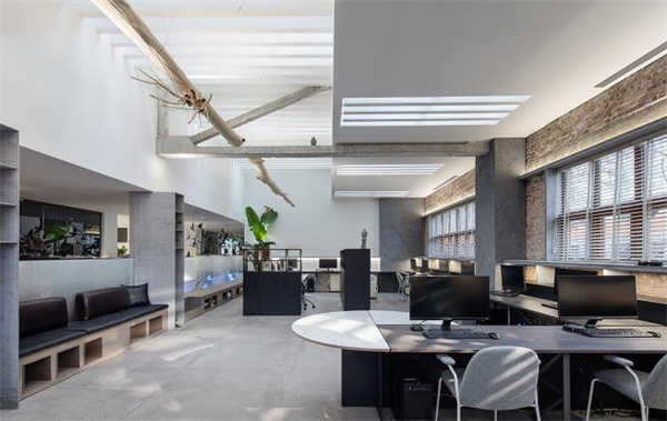 700平米的辦公室裝修設(shè)計(jì):設(shè)計(jì)師們保留了老建筑的原始磚墻,只對(duì)吊頂做了百葉格柵的造型設(shè)計(jì),與陽(yáng)光順向的造型也起到了調(diào)節(jié)空間光線的作用,另外這個(gè)地方我們還吊掛了一棵一分為二的大樹。使用率較高的地方叫做“工作空間”,把較好的南北方向空間給到整個(gè)的工作空間,用較流暢的動(dòng)線來(lái)組合這個(gè)部分?!爸獠繀^(qū)域”是我們提出來(lái)的一個(gè)概念,這一部分區(qū)域完成的是企業(yè)合作伙伴在工作中的協(xié)同作戰(zhàn)訴求,其應(yīng)該被設(shè)置在有獨(dú)立出入口的中部空間?!靶蜗髤^(qū)域”是企業(yè)面對(duì)客戶的精神堡壘,我們會(huì)將其設(shè)置在空間的重點(diǎn)區(qū)位。在辦公室的后邊有一條單獨(dú)的樓梯通往樓下的茶室,也就是在一個(gè)30平米的位置中,又可以重新組成一個(gè)封閉的LOFT空間,滿足我一個(gè)人的創(chuàng)意設(shè)計(jì)和客人接待需要,這個(gè)算是留給自己的一點(diǎn)小私心。