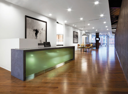 接待區(qū)地面滿鋪染色榆木地板。前臺(tái)由皂石與樹脂制作。接待區(qū)60英尺長的背景墻滿鋪板巖。