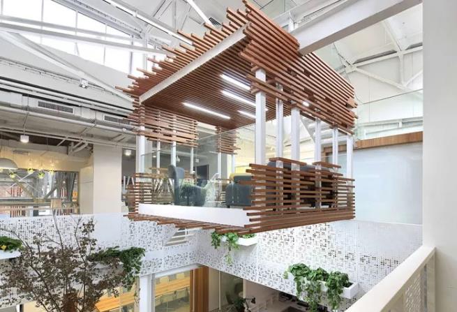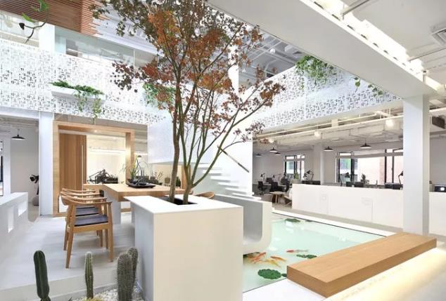 案例四:辦公樓前廳的整體設(shè)計同樣采用極簡潔的設(shè)計風(fēng)格,墻面肌理粗獷自然,前臺的造型及材質(zhì)簡單又不失穩(wěn)重的質(zhì)感,通高白色墻面正對著入口并投影播放畫面,時常宣傳公司的企業(yè)文化,在靜態(tài)中增加了整體裝飾的動感。中庭至上我們能看到一個倒掛的“樹屋”空間,由鋼結(jié)構(gòu)搭建而成。實木條拼接包裹外圍,猶如深林木屋,幫助人們減壓。透明玻璃墻面的圍合,使整個空間更加通透開闊,與整個辦公空間密切聯(lián)系。充分利用空間的同時,大大增加中庭結(jié)構(gòu)的層次感,造型上也更加豐富。辦公室裝修設(shè)計以白色簡潔為基調(diào),島臺圍合式的辦公桌設(shè)計整潔而連續(xù)。而開放式的休閑討論區(qū),便于員工們交流與共享。員工休閑餐飲區(qū)域位于二樓,這里同時設(shè)計了連接室外的休憩平臺,讓員工在工作之余可以感受室外自然。樹屋的頂部還有一個小型喝茶享受空間,發(fā)揮空間優(yōu)勢,更好地利用疊層關(guān)系。