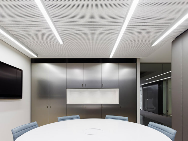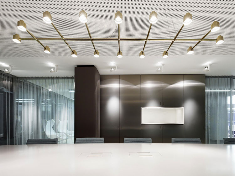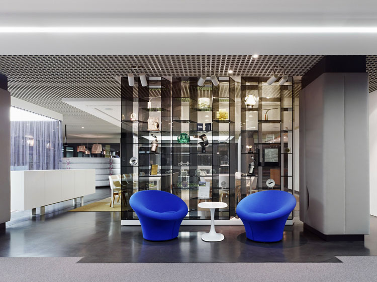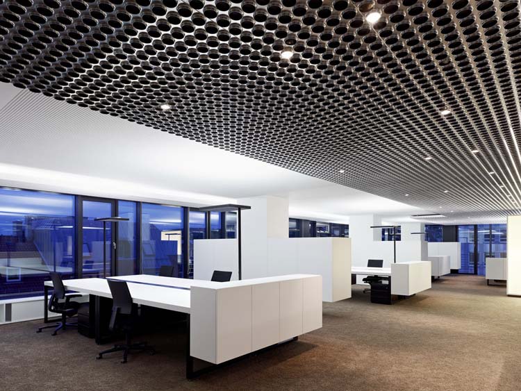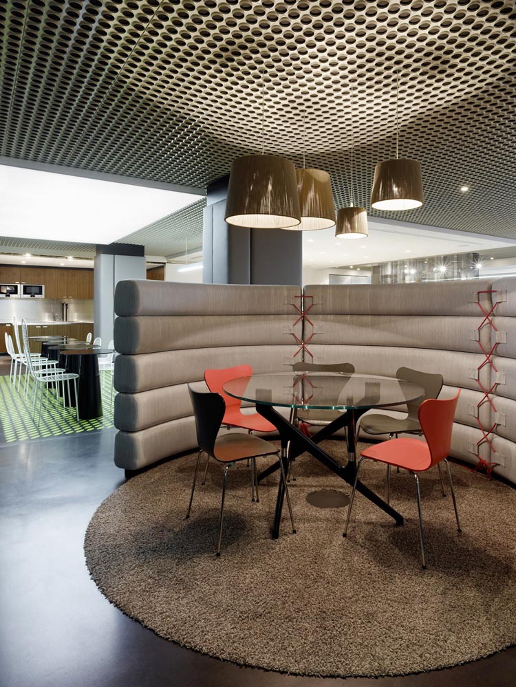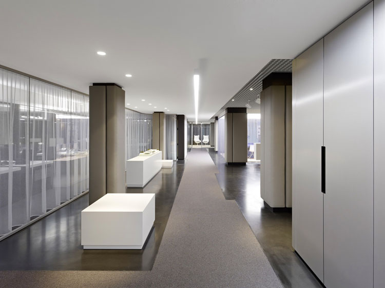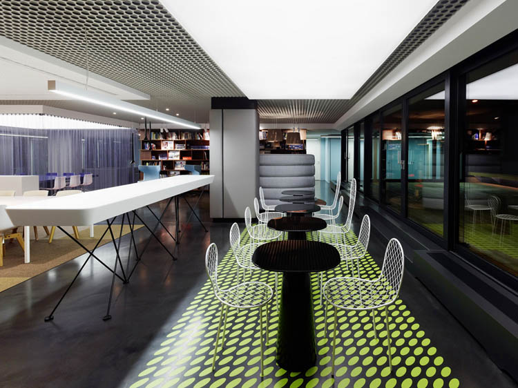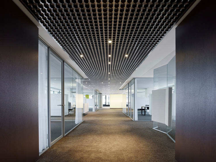 其概念是設(shè)置一個(gè)為所有部門共用的交流空間,以及滿足不同協(xié)作需要的不同分區(qū)。原先單獨(dú)、分散化的辦公室變成大型開放式的辦公空間,鼓勵(lì)同事之間的交流。每一個(gè)樓層都有單獨(dú)的辦公室和單獨(dú)的工作組空間,以及大型開放式工作間。各個(gè)工作站的工作人員能夠相互交流。玻璃立面的辦公室中,十字形的結(jié)構(gòu)將開放式的空間分隔為各個(gè)單元,但又是集中的工作環(huán)境。一系列暖色調(diào)的材料營造出不同的氣氛,有時(shí)候讓員工感覺到像在家里一樣。辦公樓中的地毯有著清晰的路徑指示和功能分區(qū)。就餐區(qū)地板上的綠點(diǎn)如同變魔術(shù)一樣變出草地的效果,構(gòu)筑起通向露臺的一道概念式的橋梁。向露臺打開的半圓形裝飾空間與其他部分區(qū)分開來,透明的蕾絲幕布構(gòu)成了半私密的空間,而清新的色彩、深藍(lán)色的桌子和粉色的地毯,無不為員工帶來激發(fā)工作情緒的氛圍。